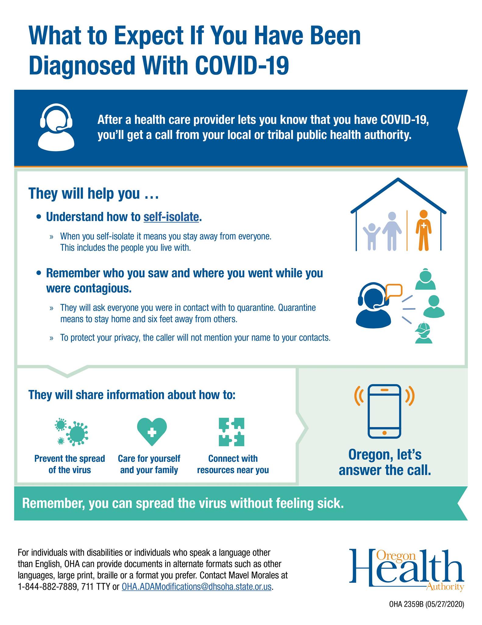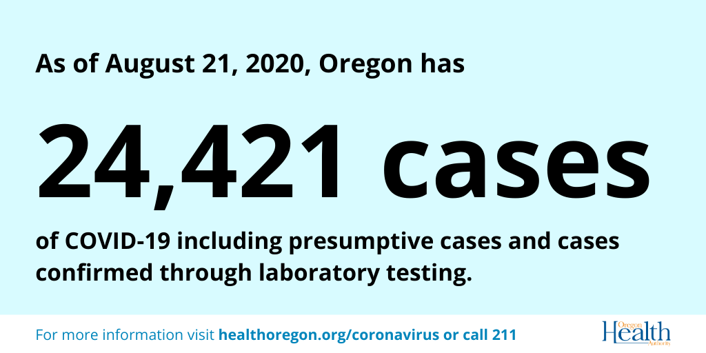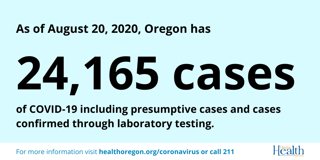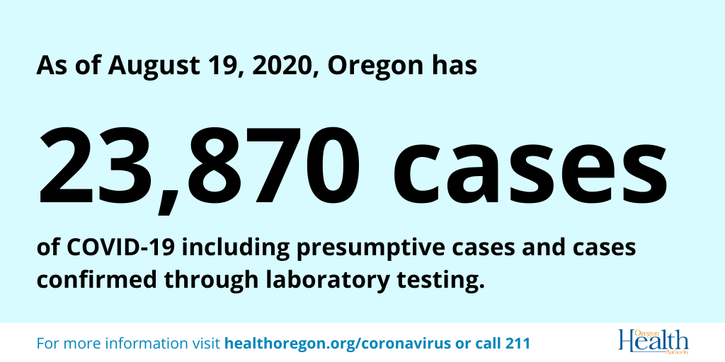 We want to keep you informed about COVID-19 in Oregon. Data are provisional and change frequently. • 22,629 patients tested positive. • 477,286 patients tested negative. Oregon Health Authority reported 203 new confirmed and presumptive cases of COVID-19 as of 12:01 a.m. today bringing the state total to 23,870. The new cases reported today are in the following counties: Baker (1), Clackamas (15), Columbia (3), Crook (1), Deschutes (4), Douglas (1), Hood River (1), Jackson (24), Jefferson (9), Josephine (2), Klamath (1), Lane (5), Linn (3), Malheur (10), Marion (30), Morrow (1), Multnomah (41), Polk (4), Tillamook (1), Umatilla (11), Union (3), Washington (25), and Yamhill (7). Oregon’s 398th COVID-19 death is a 70-year-old woman in Multnomah County who tested positive on August 7 and died on August 16, at Providence Portland Medical Center. She had underlying conditions. Oregon’s 399th COVID-19 death is an 83-year-old woman in Polk County who tested positive on August 4 and died on August 15, in her residence. She had underlying conditions. Oregon’s 400th COVID-19 death is a 99-year-old woman in Washington County who tested positive on August 10 and died on August 18, in her residence. She had underlying conditions. Oregon’s 401st COVID-19 death is a 93-year-old woman in Multnomah County who tested positive on August 4 and died on August 9, in her residence. She had underlying conditions. Oregon’s 402nd COVID-19 death is a 90-year-old woman in Multnomah County who tested positive on July 25 and died on August 13, at Legacy Meridian Park Medical Center. She had underlying conditions. Oregon’s 403rd COVID-19 death is a 73-year-old woman in Multnomah County who tested positive on July 16 and died on August 11, in her residence. She had underlying conditions. Oregon’s 404th COVID-19 death is an 84-year-old man in Clackamas County who tested positive on June 21 and died on August 11, at Providence Willamette Falls Medical Center. He had underlying conditions. Oregon’s 405th COVID-19 death is a 60-year-old man in Multnomah County who tested positive on July 15 and died on August 1, at Adventist Medical Center. He had underlying conditions. Oregon’s 406th COVID-19 death is an 88-year-old man in Clackamas County who tested positive on July 13 and died on July 25, at Adventist Medical Center. He had underlying conditions. Oregon’s 407th COVID-19 death is a 94-year-old man in Clackamas County who tested positive on July 30 and died on August 8, at Providence Portland Medical Center. He had underlying conditions. Oregon’s 408th COVID-19 death is an 86-year-old woman in Multnomah who became symptomatic on August 10, after close contact with a confirmed case and died on August 14, in her residence. She had underlying conditions. For more information, visit healthoregon.org/coronavirus