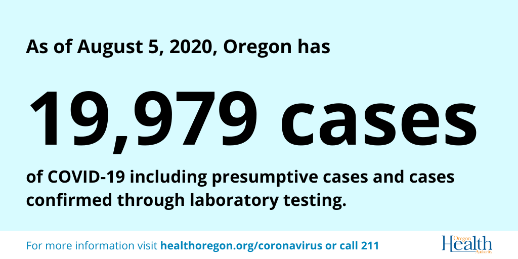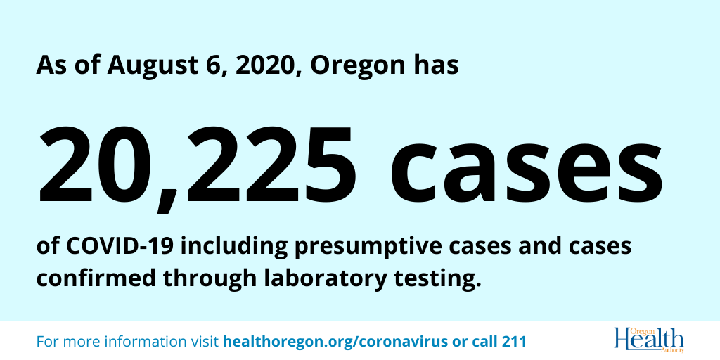 We want to keep you informed about COVID-19 in Oregon. Data are provisional and change frequently. • 19,562 patients tested positive. • 417,057 patients tested negative. Oregon Health Authority reported 423 new confirmed and presumptive cases of COVID-19 as of 12:01 a.m. today bringing the state total to 20,636. The new cases reported today are in the following counties: Baker (1), Benton (3), Clackamas (16), Clatsop (1), Columbia (2), Deschutes (18), Douglas (3), Grant (1), Hood River (3), Jackson (12), Jefferson (5), Josephine (3), Klamath (1), Lane (13), Lincoln (1), Linn (6), Malheur (21), Marion (47), Morrow (21), Multnomah (110), Polk (7), Umatilla (53), Union (2), Wasco (3), Washington (53), and Yamhill (17). Oregon’s 340th COVID-19 death is a 90-year-old man in Clackamas County who tested positive on July 30 and died on August 5. His place of death is being confirmed. He had underlying conditions. Oregon’s 341st COVID-19 death is an 80-year-old woman in Deschutes County who tested positive on July 20 and died on July 31. Place of death and presence of underlying conditions are being confirmed. Oregon’s 342nd COVID-19 death is an 80-year-old man in Jackson County who tested positive on July 15 and died on August 6. His place of death is unavailable at this time. He had underlying conditions. Oregon’s 343rd COVID-19 death is a 75-year-old man in Jefferson County who tested positive on July 10 and died on August 5, at St. Charles Medical Center in Bend. He had underlying conditions. Oregon’s 344th COVID-19 death is a 64-year-old man in Klamath County who tested positive on July 27 and died on August 6, at Sky Lakes Medical Center. He had underlying conditions. Oregon’s 345th COVID-19 death is an 88-year-old man in Malheur County who tested positive on July 28 and died on August 2 in his residence. Presence of underlying conditions is being confirmed. Oregon’s 346th COVID-19 death is a 75-year-old man in Marion County who tested positive on July 8 and died on August 5 in his residence. He had underlying conditions. Oregon’s 347th COVID-19 death is 94-year-old man in Umatilla County who tested positive on July 16 and died on August 4 in his residence. He had underlying conditions. Oregon’s 348th COVID-19 death is a 93-year-old woman in Yamhill County who tested positive on July 28 and died on August 6. Place of death and presence of underlying conditions are being confirmed. For more information, visit healthoregon.org/coronavirus