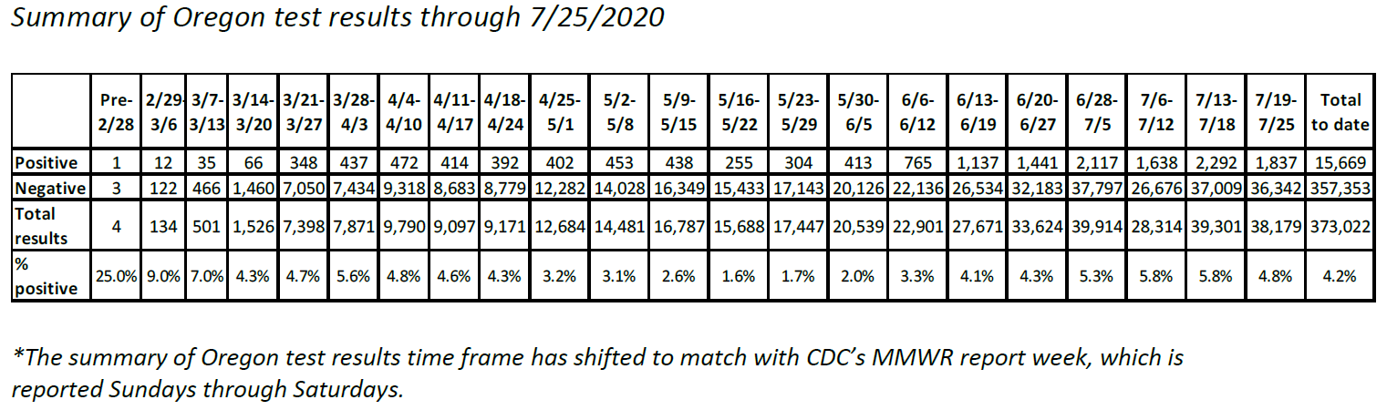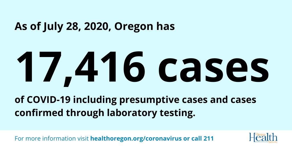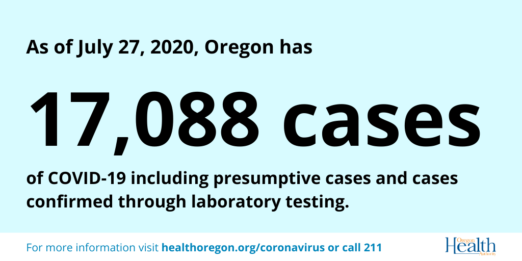 We want to keep you informed about COVID-19 in Oregon. Data are provisional and change frequently. • 16,546 patients tested positive. • 370,240 patients tested negative. Oregon Health Authority reported 342 new confirmed and presumptive cases of COVID-19 as of 12:01 a.m. today bringing the state total to 17,416. The new cases are in the following counties: Benton (3), Clackamas (15), Clatsop (3), Coos (3), Crook (2), Curry (1), Deschutes (7), Douglas (2), Harney (1), Jackson (10), Jefferson (9), Josephine (9), Klamath (2), Lane (6), Linn (5), Malheur (15), Marion (40), Morrow (7), Multnomah (74), Polk (13), Umatilla (75), Washington (31), and Yamhill (9). As we surpass 300 deaths related to COVID-19, including the 14 deaths reported today, we wish to extend our sincere condolences to the families who have lost a loved one to this disease. It is a stark reminder of the work all Oregonians need to do to bring this pandemic under control. Together we can slow this disease and prevent this terrible loss of life. Oregon’s 290th COVID-19 death is a 77-year-old male in Multnomah County who tested positive on June 19 and died on July 22 at Portland Adventist Medical Center. He had underlying conditions. Oregon’s 291st COVID-19 death is a 79-year-old male in Multnomah County who tested positive on July 3 and died on July 20 at Portland Adventist Medical Center. He had underlying conditions. Oregon’s 292nd COVID-19 death is a 77-year-old female in Jefferson County who tested positive on June 30 and died on July 23 at St Charles Medical Center in Bend. Presence of underlying conditions is being confirmed. Oregon’s 293rd COVID-19 death is a 94-year-old female in Clackamas County who tested positive on July 19 and died on July 26 in her residence. She had underlying conditions. Oregon’s 294th COVID-19 death is a 54-year-old male in Malheur County who tested positive on June 24 and died on July 15 at St Luke’s Nampa Medical Center. He had underlying conditions. Oregon’s 295th COVID-19 death is a 26-year-old male in Yamhill County who died in his residence on July 10. The death certificate listed COVID-19 disease or SARS-CoV-2, as a cause of death or as a significant condition that contributed to his death. Oregon’s 296th COVID-19 death is a 91-year-old female in Clackamas County who became symptomatic on July 22nd, after close contact with a confirmed case, and died on July 26th. Location of death and presence of underlying medical conditions are being confirmed. Oregon’s 297th COVID-19 death is an 88-year-old male in Deschutes County who tested positive on July 23 and died on July 25 at St Charles Medical Center in Bend. He had underlying conditions. Oregon’s 298th COVID-19 death is a 78-year-old female in Deschutes County who tested positive on July 12 and died on July 23. Location of death is being confirmed. She had underlying conditions. Oregon’s 299th COVID-19 death is a 64-year-old female in Jefferson County who tested positive on July 14 and died on July 27. Location of death and presence of underlying conditions are being confirmed. Oregon’s 300th COVID-19 death is an 82-year-old female in Jefferson County who tested positive on July 20 and died on July 26. Location of death is being confirmed. She had underlying conditions. Oregon’s 301st COVID-19 death is an 87-year-old male in Marion County who tested positive on July 14 and died on July 26 at Salem Hospital. He had underlying conditions. Oregon’s 302nd COVID-19 death is a 66-year-old female in Marion County who tested positive on July 14 and died on July 24. Location of death is being confirmed. She had underlying conditions. Oregon’s 303rd death is an 84-year-old female in Umatilla County who tested positive on July 22 and died on July 25. Location of death is being confirmed. She had underlying conditions. For more information, visit healthoregon.org/coronavirus