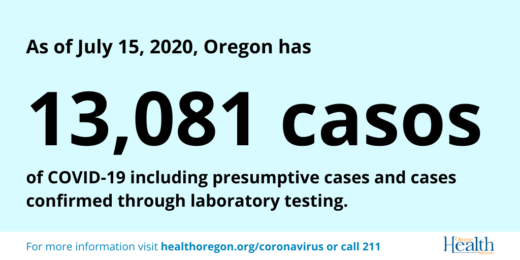 We want to keep you informed about COVID-19 in Oregon. Data are provisional and change frequently. • Samples for 12,406 patients tested positive. • Samples for 298,705 patients tested negative. Oregon Health Authority reported 282 new confirmed and presumptive cases of COVID-19 as of 12:01 a.m. today bringing the state total to 13,081. The new confirmed and presumptive COVID-19 cases reported today are in the following counties: Baker (1), Benton (1), Clackamas (24), Columbia (2), Coos (2), Crook (1), Deschutes (12), Douglas (4), Jackson (9), Jefferson (2), Josephine (1), Klamath (1), Lane (9), Lincoln (2), Linn (2), Malheur (15), Marion (38), Morrow (3), Multnomah (59), Polk (4), Tillamook (1), Umatilla (27), Union (4), Wasco (2), Washington (50), and Yamhill (6). Oregon’s 244th COVID-19 death is a 63-year-old man in Deschutes County who tested positive on June 13 and died on June 14, at St. Charles Medical Center. He had underlying conditions. Oregon’s 245th COVID-19 death is a 61-year-old man in Multnomah County who tested positive on April 13 and died on May 6, in his residence. He had underlying conditions. Oregon’s 246th death is an 85-year-old woman in Multnomah County who tested positive on April 11 and died on June 20, at Providence Portland Medical Center. She had underlying conditions. Oregon’s 247th death is a 61-year-old woman in Douglas County who tested positive on June 28 and died on July 12, at Covenant Hospital in Lubbock, Texas. She had underlying conditions. NOTE: The death of a 71-year-old woman from Multnomah County who died on May 5 was accidentally reported twice — once in the May 7 press release as Oregon’s 120th death, and again in the May 8 press release as Oregon’s 124th death. We regret the error. The total number of deaths today has been amended to reflect this change. For more information, visit healthoregon.org/coronavirus