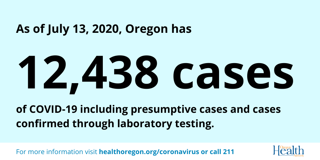 We want to keep you informed about COVID-19 in Oregon. Data are provisional and change frequently. • Samples for 11,795 patients tested positive. • Samples for 288,274 patients tested negative. Oregon Health Authority reported 280 new confirmed and presumptive cases of COVID-19 as of 12:01 a.m. today bringing the state total to 12,438. The new confirmed and presumptive COVID-19 cases reported today are in the following counties: Clackamas (20), Columbia (6), Coos (2), Gilliam (1), Hood River (2), Jackson (3), Klamath (1), Lane (4), Linn (1), Malheur (27), Marion (36), Morrow (9), Multnomah (82), Polk (2), Umatilla (28), Wallowa (1), Washington (47), and Yamhill (8). Oregon’s 235th COVID-19 death is a 67-year-old man in Marion County who tested positive on July 8 and died July 11, in his residence. He had underlying conditions. Oregon’s 236th COVID-19 death is a 76-year-old man in Clackamas County who tested positive on July 1 and died July 4, in his residence. He had underlying conditions. Oregon’s 237th COVID-19 death is a 54-year-old man in Umatilla County who died on July 8 in his residence and tested positive post-mortem on July 9. He had underlying conditions. An outbreak of 20 cases has been reported at Shearer’s Foods in Umatilla County. The case count includes all persons linked to the outbreak, which may include household members and other close contacts to an employee. The outbreak investigation started on June 26, but the initial case count was below the threshold for public disclosure. An outbreak of 102 cases has been reported at Snake River Correctional Institution in Malheur County. The case count includes all Oregon residents linked to the outbreak, which may include household members and other close contacts to an employee. The case count does not include any Idaho residents who may be associated with the outbreak, as laboratories report positive tests results to the state in which an individual resides. OHA is working closely with Idaho to coordinate contact tracing across state lines. The outbreak investigation started on June 24, but at that time the case count was below the threshold for public disclosure. The outbreak was reported in the COVID-19 Weekly Report on July 8 with six cases. State and county public health officials are working with these organizations to address these outbreaks and protect the health of workers. For more information, visit healthoregon.org/coronavirus