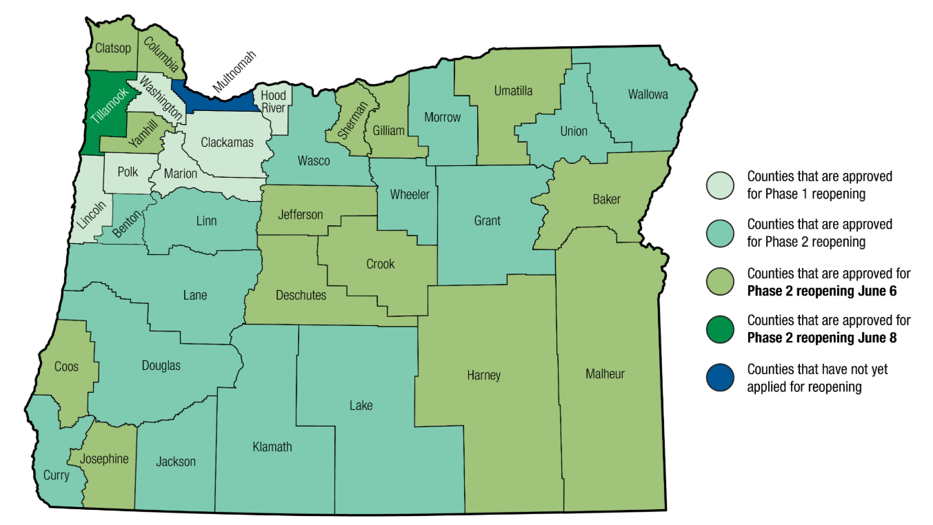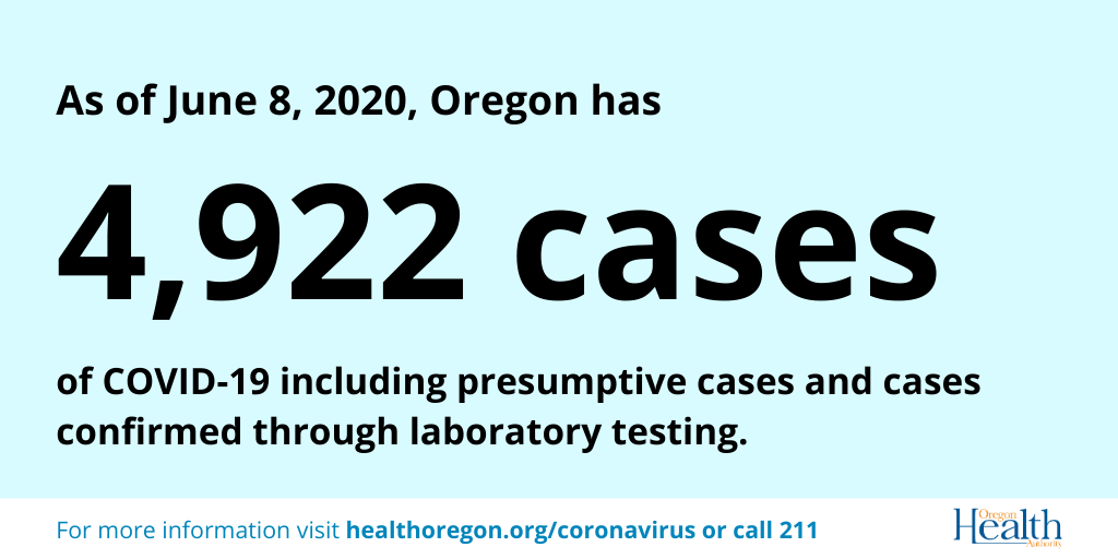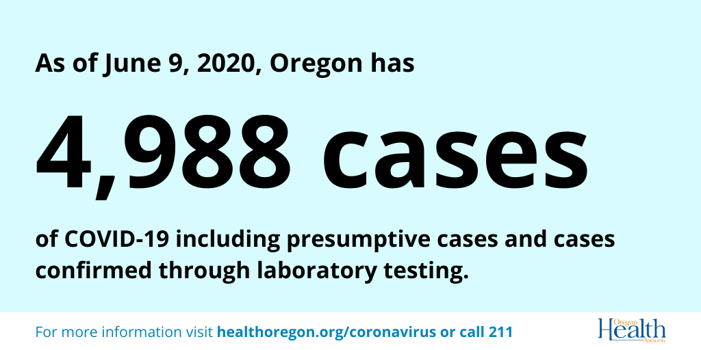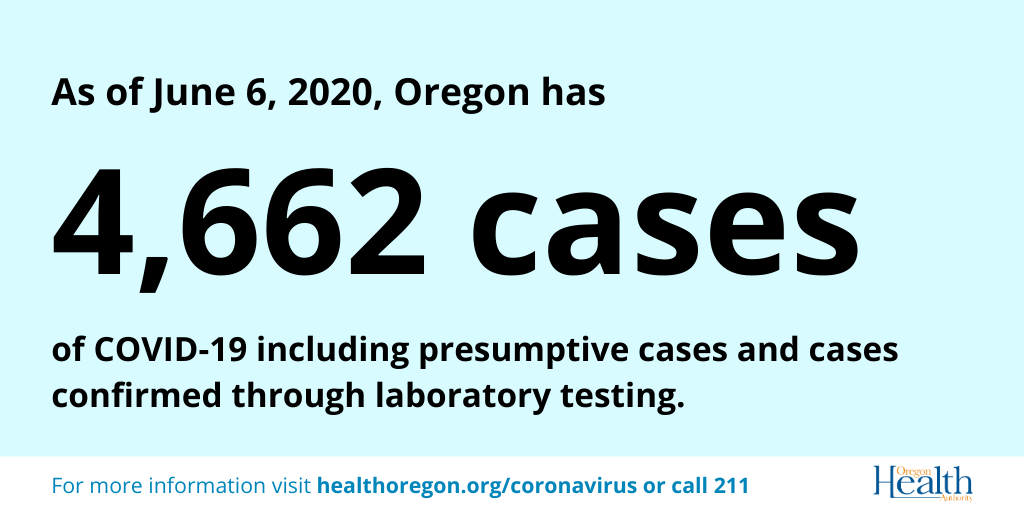 We want to keep you informed about COVID-19 in Oregon. Data are provisional and change frequently. • Samples for 4,442 patients tested positive. • Samples for 138,676 patients tested negative. Oregon Health Authority reported 97 new confirmed and presumptive cases of COVID-19 as of 12:01 a.m. today, bringing the state total to 4,570. The new cases are in the following counties: Benton (5), Clackamas (6), Deschutes (1), Douglas (1), Hood River (9), Jefferson (9), Klamath (1), Lincoln (4), Linn (3), Malheur (1), Marion (17), Multnomah (12), Umatilla (1), Wasco (3), Washington (20), Yamhill (4). Oregon’s 160th COVID-19 death is a 63-year-old man in Multnomah County, who tested positive on April 29 and died June 3, at the Portland VA Medical Center. He had underlying medical conditions. Oregon’s 161st COVID-19 death is a 96-year-old woman in Marion County, who tested positive on May 31 and died June 3, at Salem Hospital. She had underlying medical conditions. Notes: • One case previously reported in Crook County was determined not to be a case. The county case count has been appropriately adjusted. • One case previously reported in Deschutes County was determined not to be a case. The county case count has been appropriately adjusted. Today’s COVID-19 case count marked the third highest daily count since the onset of the pandemic in Oregon with 97 presumptive and confirmed cases reported to OHA. That brings the total for the past three days to 238 reported cases. The higher numbers are tied to several factors including the availability of more widespread testing, increased contact tracing, and active monitoring of close contacts of cases. There has been an increase in the number of household cases associated with a confirmed case. Workplace outbreaks are another source of the higher numbers. Many of these are seasonal facilities and many are following public health recommendations by offering testing to their employees. Although the numbers are higher, the overall rate of infection remains among the lowest in the U.S. But higher case counts serve as a reminder that Oregonians need to continue to maintain physical distancing, wear face coverings where physical distancing cannot be maintained, avoid large gatherings, and follow good hand hygiene. For more information, visit healthoregon.org/coronavirus